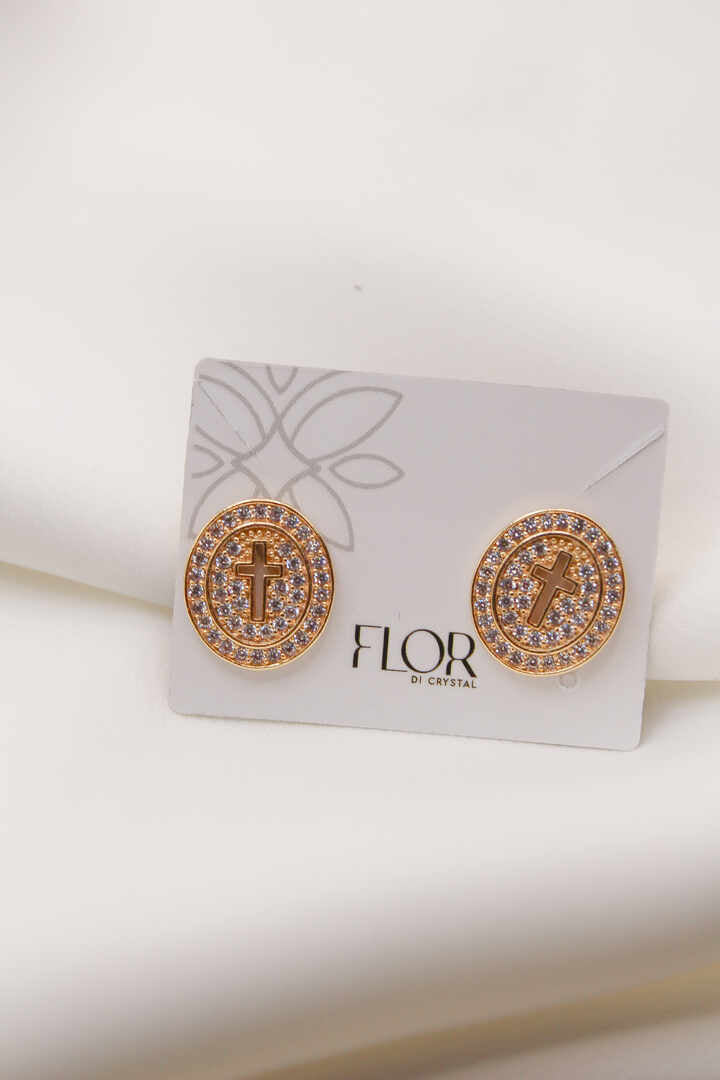 Brinco cravejado oval de detalhe vasado de cruz