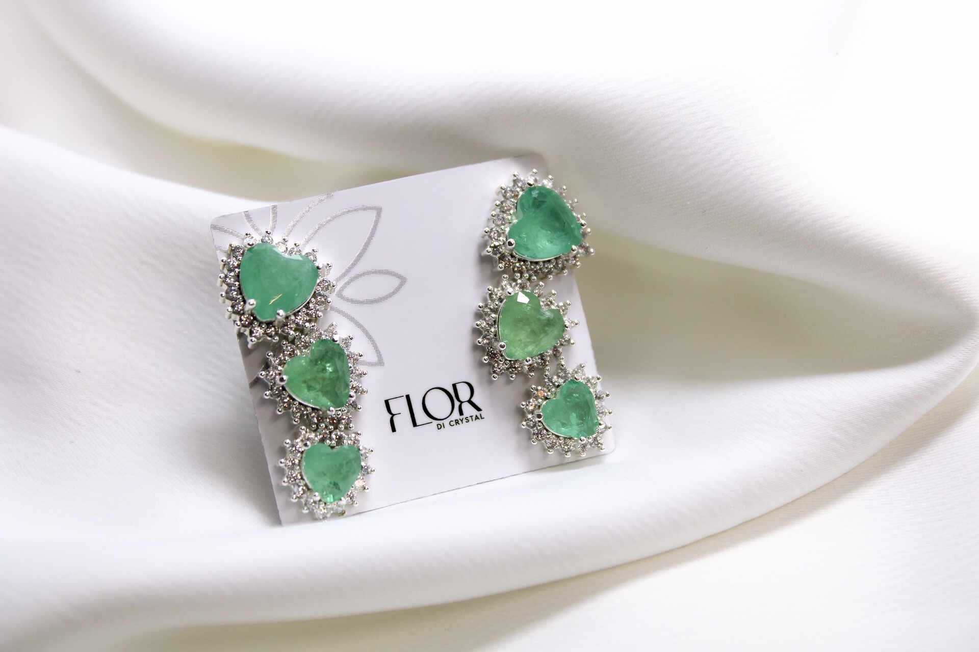 Trio de brinco de coracao cravejado de zirc. com pedra fusion -verde claro