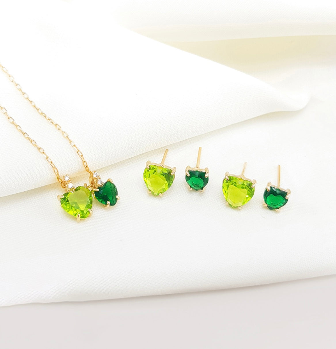 Conjunto Brinco duplos e colar de pingente duplos- verde esmeralda e verde lima