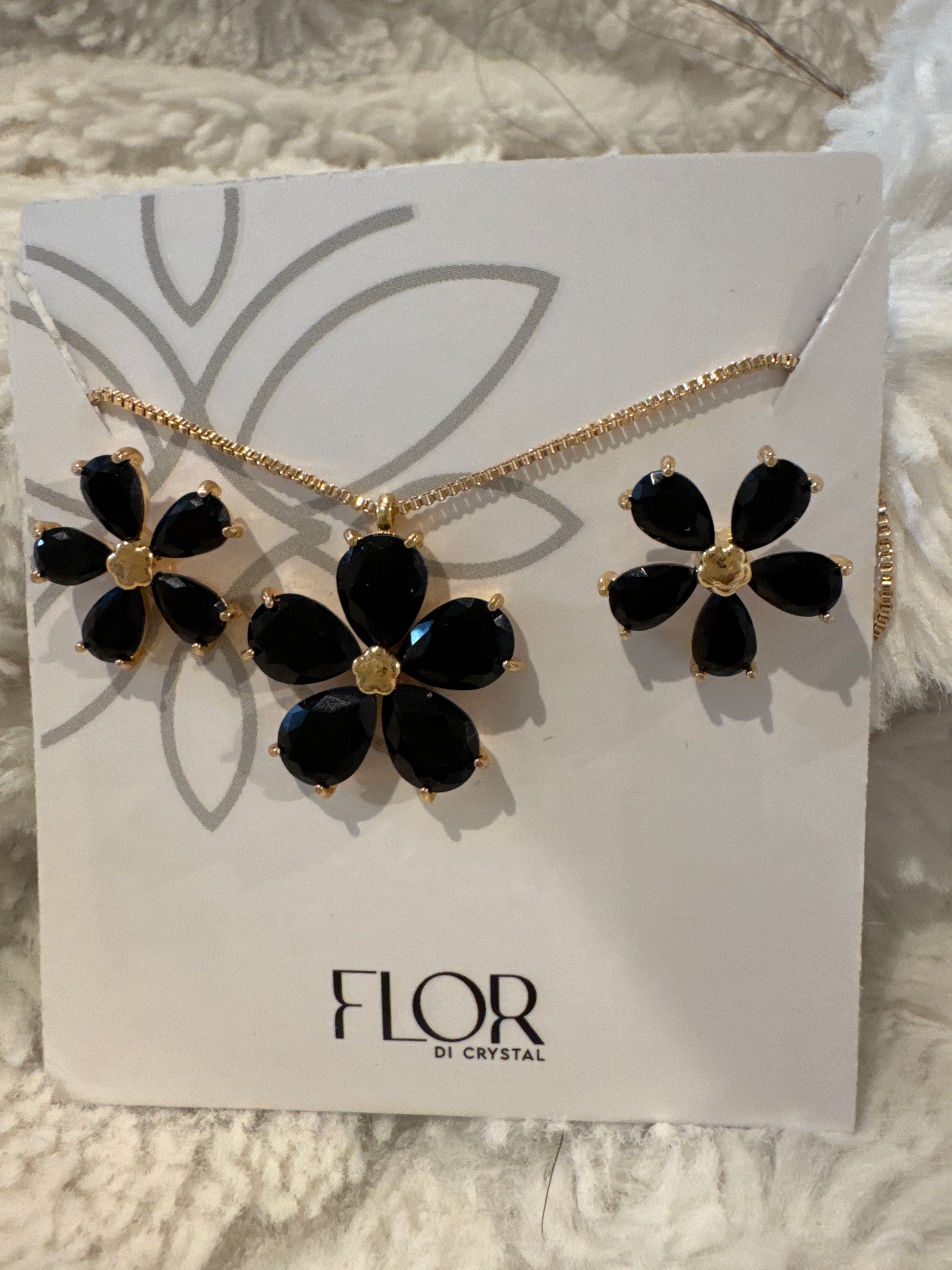 Conjunto colar e brinco Flor de cristal preto