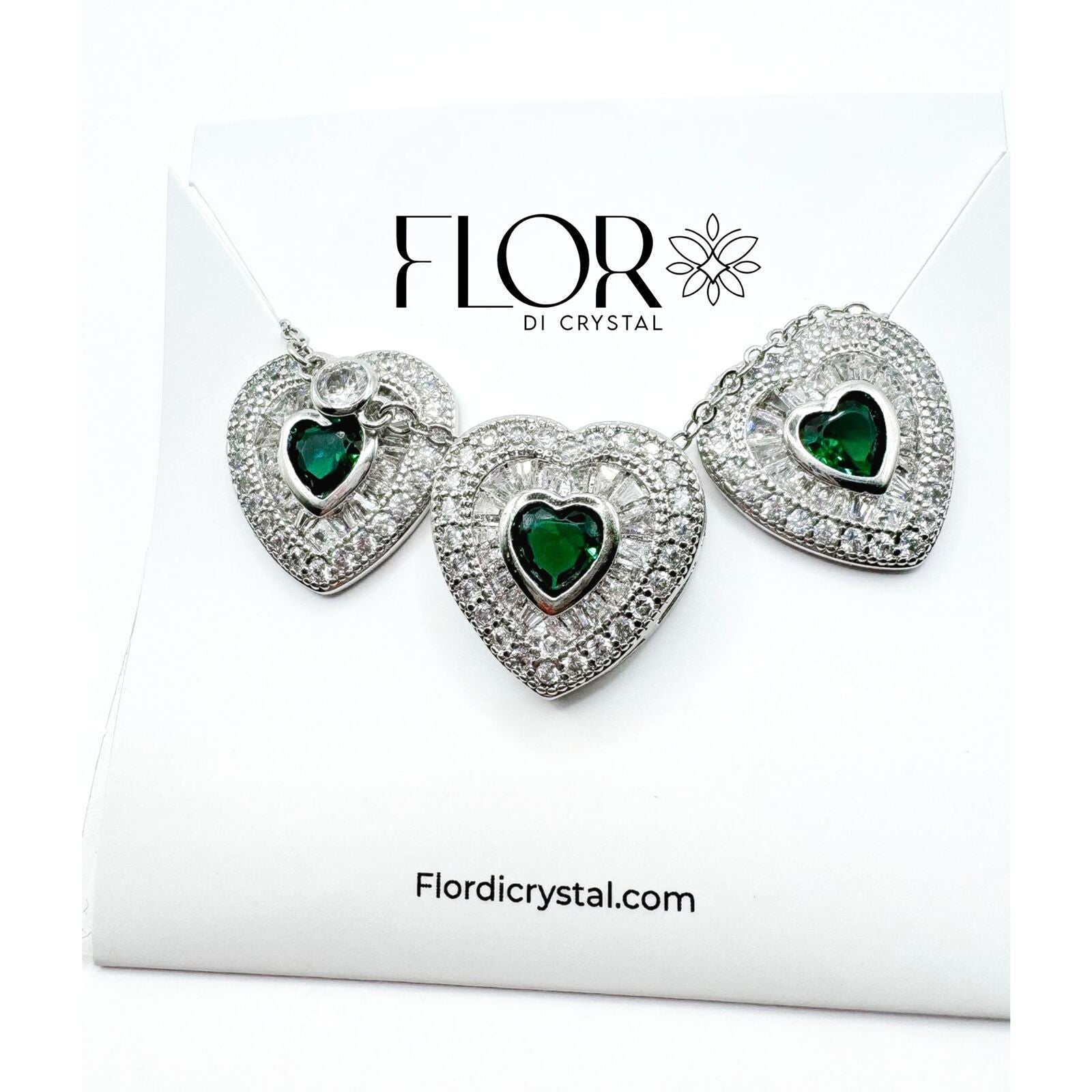conjunto de Coracao Micocravejada com Zirconia navete crystal e coracao Verde - Luxo