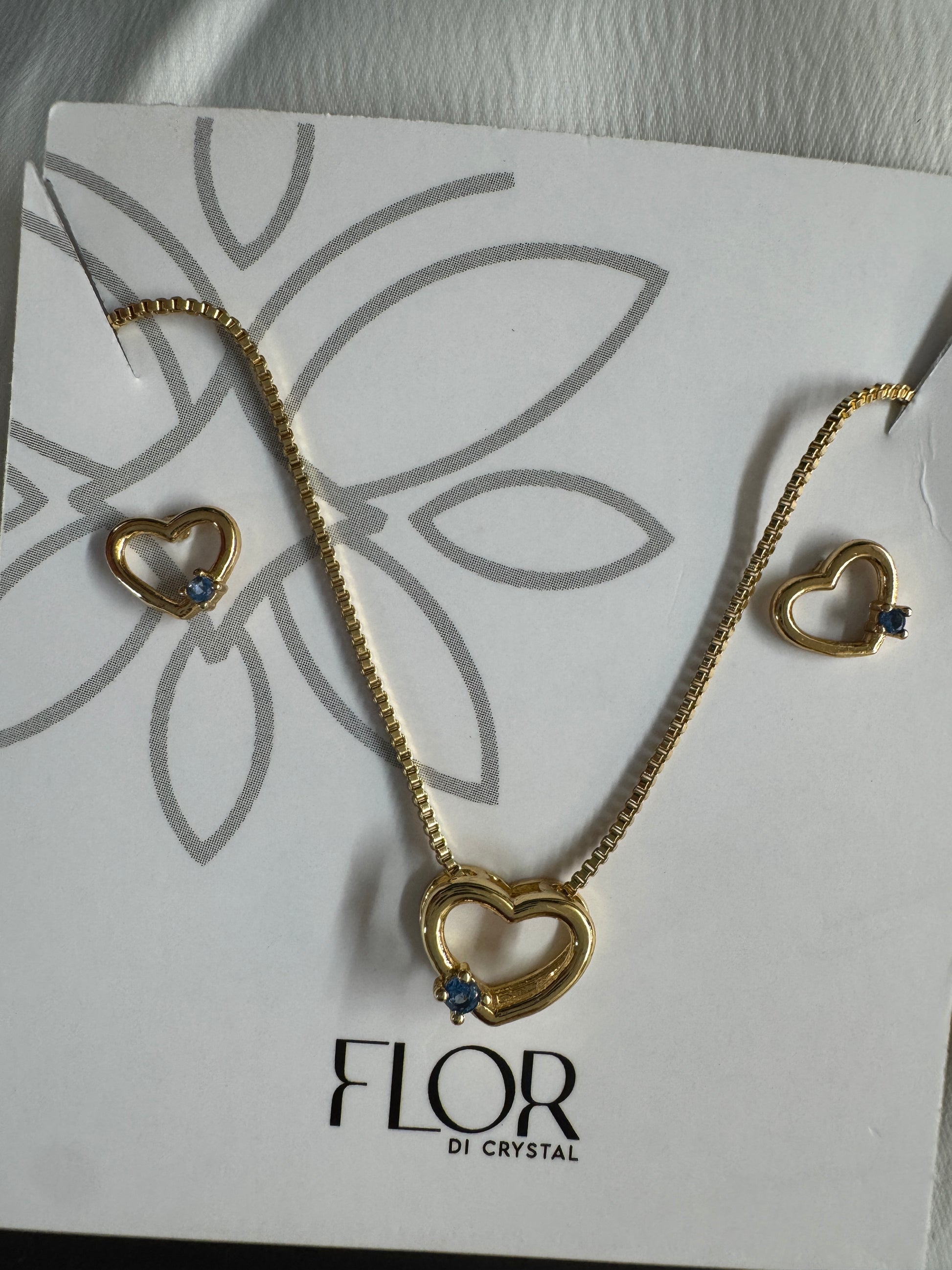Conjunto delicado de coracao vasado cravejado -AZUL