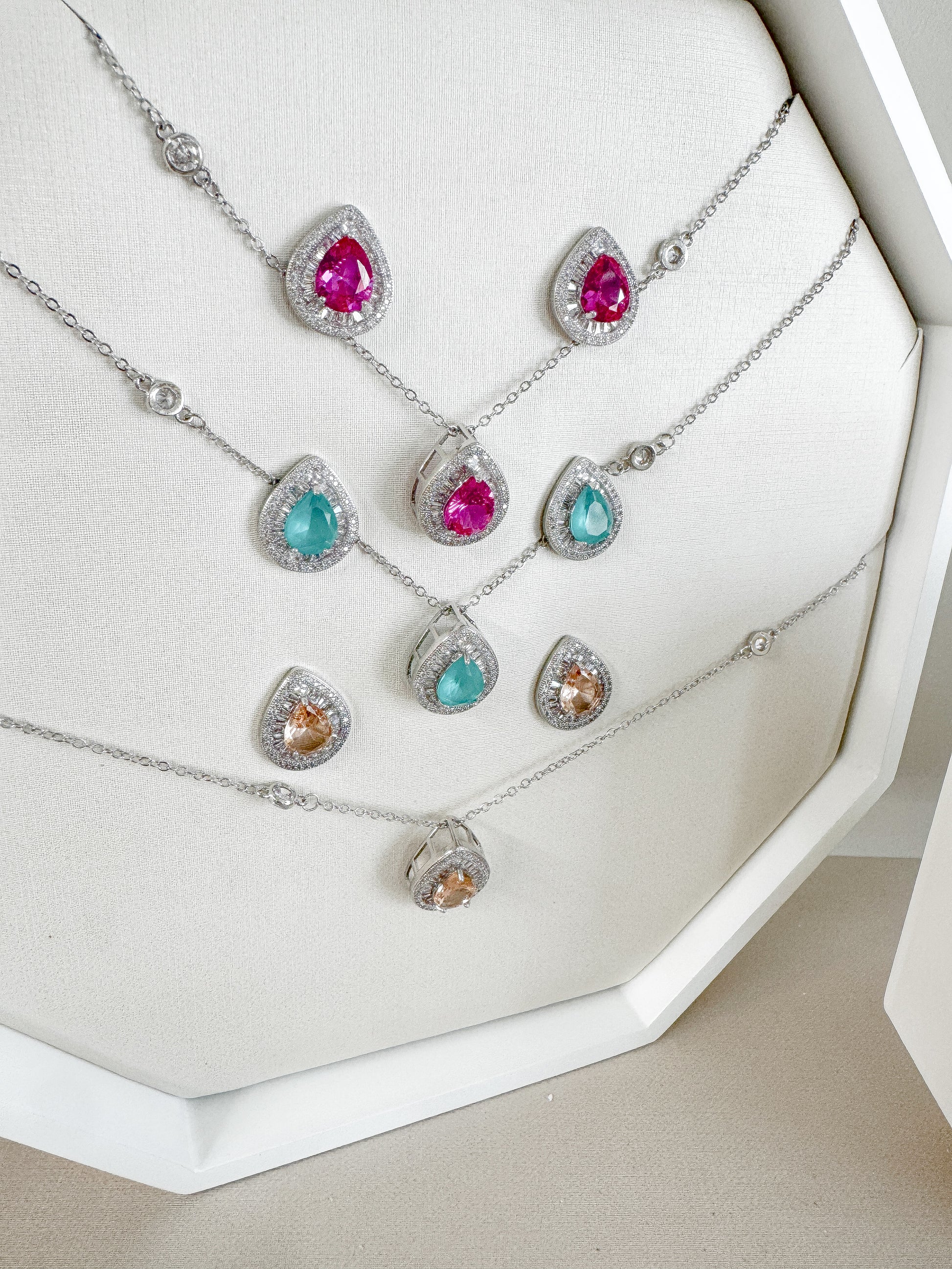 conjunto Gota Micocravejada com Zirconia FUSHIA- Luxo c/ corrente em ponto de luz